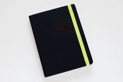 The Dot Grid Journal is part of Behance’s Action Method product line – a set of paper products designed to support their Action Method project methodology. They’ve got a wide range of products, from pre-printed loose sheets to spiral bound notebooks, to stickers – the goal of which is to focus the user on action items. This journal, however, can easily be used without any reference to the Action Method. While the back pocket comes stuffed with two sets of Action Stickers and a couple of pamphlets on the Action Method, the book itself is simply a hardbound journal filled with dot grid paper.