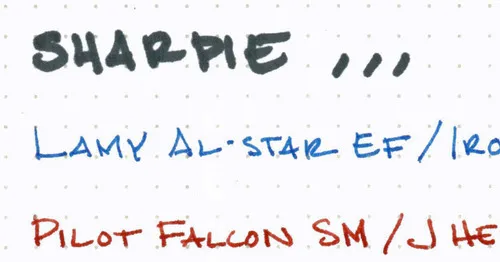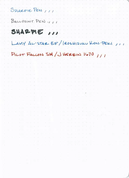 Fountain pen ink is the bad news, however. On this paper, both watery inks like Iroshizuku Kon-peki and thicker, more viscous inks, like J. Herbin 1670 result in significant show-through and moderate bleed-through. Anything wet goes right through the paper. Worst of all, though, is that the dots themselves repel fountain pen ink. It looks like the pen is skipping. This is in no way a fountain-pen friendly notebook.