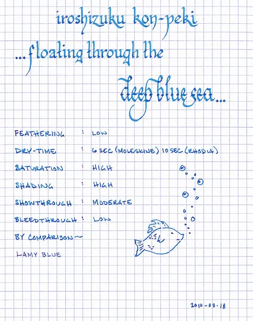 The dry time of Kon-peki is similar to other Iroshizuku inks: on Moleskine paper, it takes roughly six seconds, and on Rhodia, ten seconds. The pen I used for the review, a Lamy Studio, tends to write wet, however – which increases the dry time when compared to my Lamy Safari or 2000. Also, I typically write on an incline, which often causes ink to pool at the bottom of letters, thus increasing the time it takes ink to dry when compared to writing on a flat surface. Therefore, flat-writers might experience a quicker dry time.